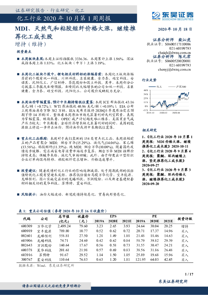东吴证券:化工行业2020年10月第1周周报:MDI、天然气和粘胶短纤价格大涨,继续推荐化工成长股.pdf