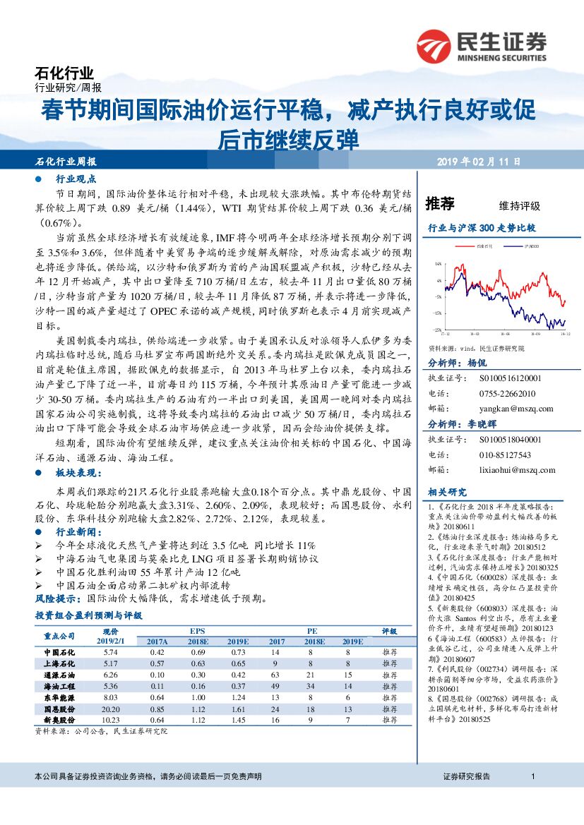 民生证券:石化行业周报:春节期间国际油价运行平稳,减产执行良好或促后市继续反弹.pdf