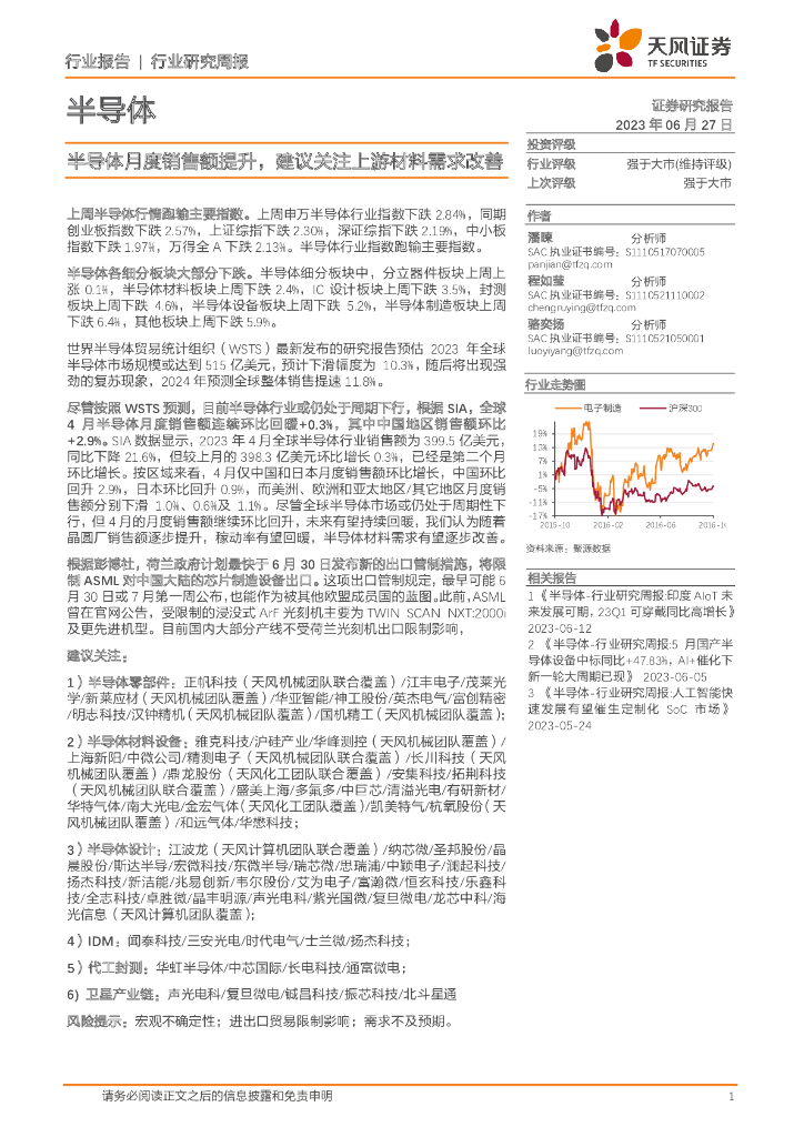 天风证券:半导体行业研究周报:半导体月度销售额提升,建议关注上游材料需求改善.pdf