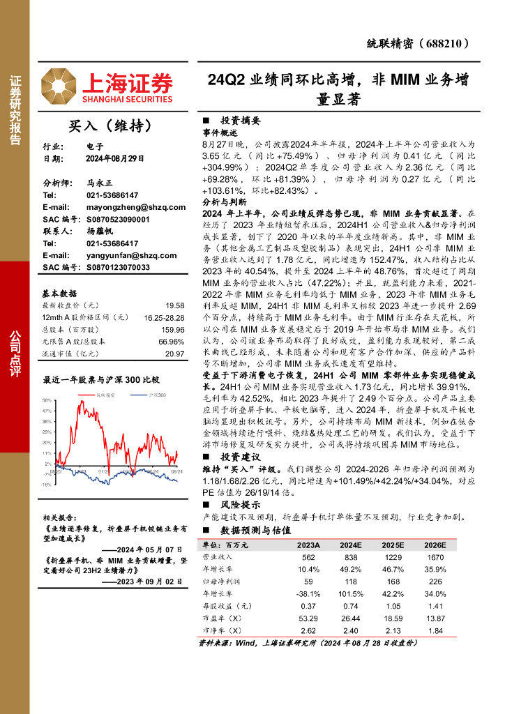上海证券:统联精密(688210)-24Q2业绩同环比高增,非MIM业务增量显著.pdf