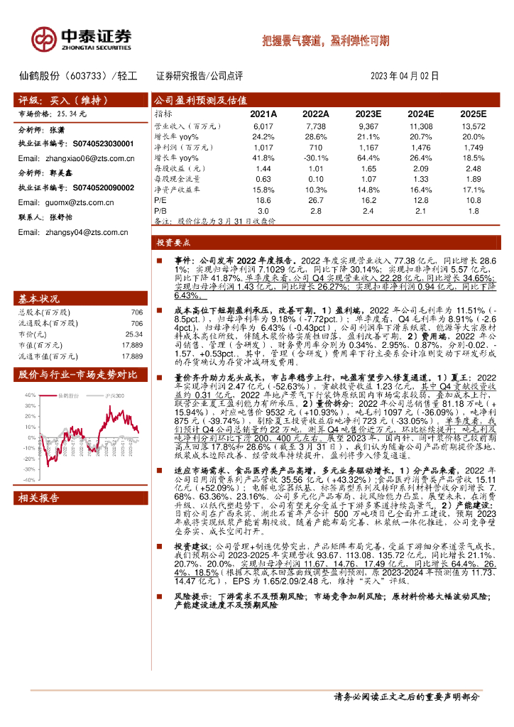 中泰证券:仙鹤股份(603733)-把握景气赛道,盈利弹性可期.pdf