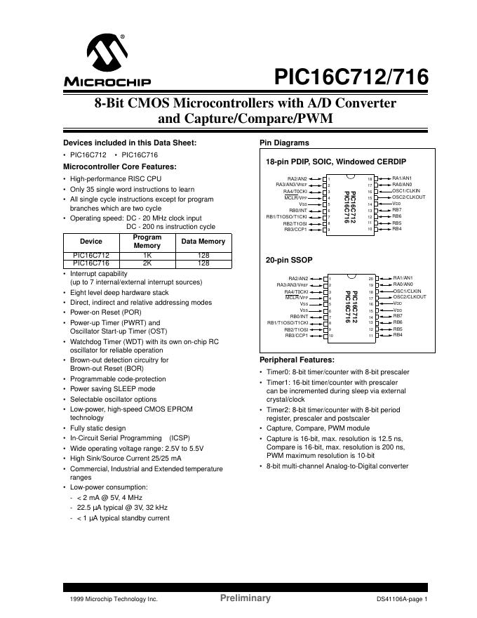 MICROCHIP PIC16C712/716 8-Bit CMOS Microcontrollers with A/D Converter and Capture/Compare/PWM 数据手册.pdf