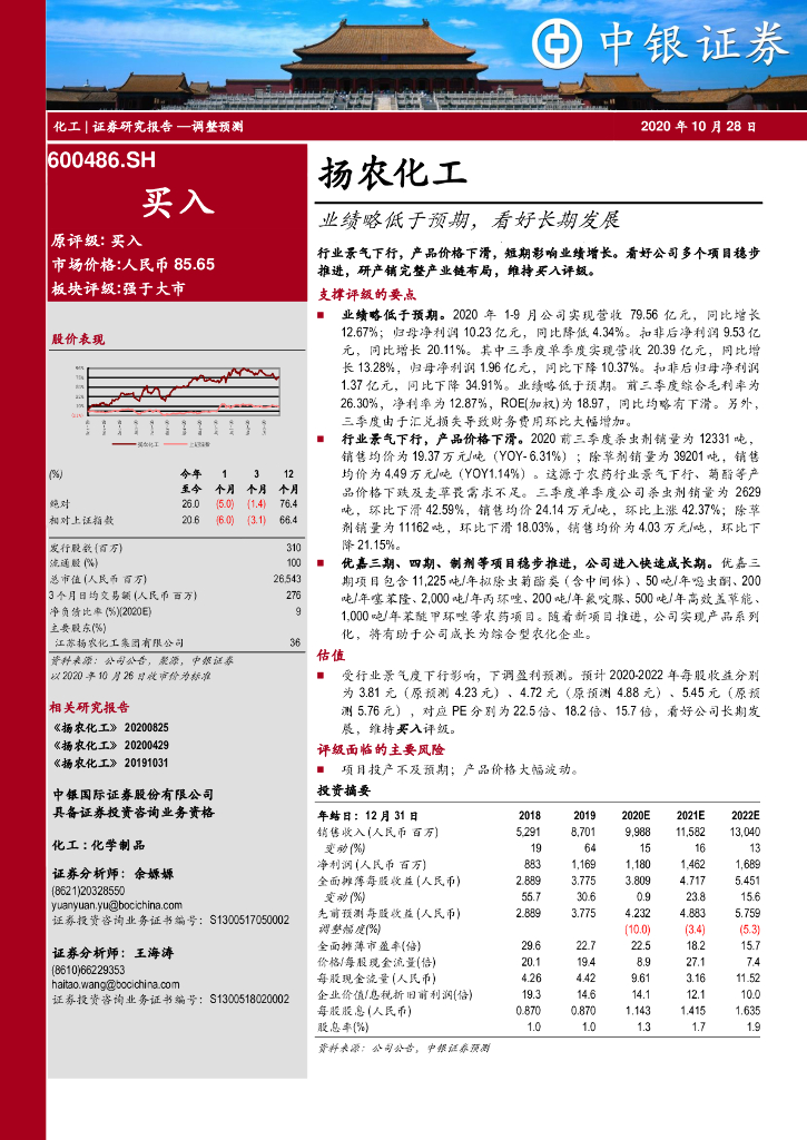 中银证券:扬农化工(600486)-业绩略低于预期,看好长期发展.pdf