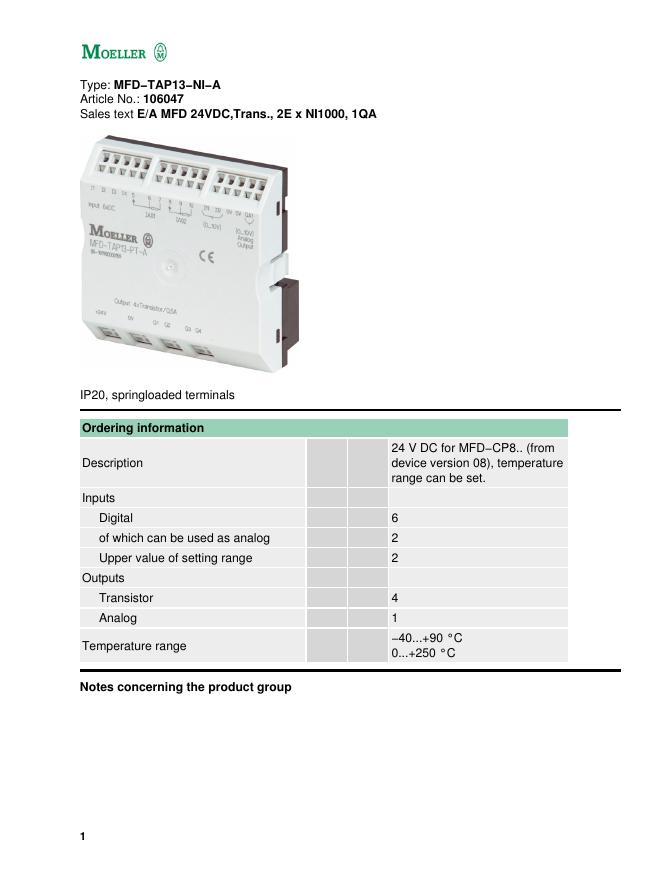 MOELLER - Type: MFD-TAP13-NI-A Article No.: 106047 Sales text E/A MFD 24VDC,Trans., 2E x NI1000, 1QA 使用手册.pdf