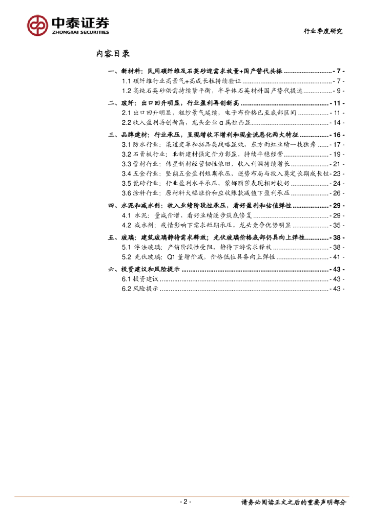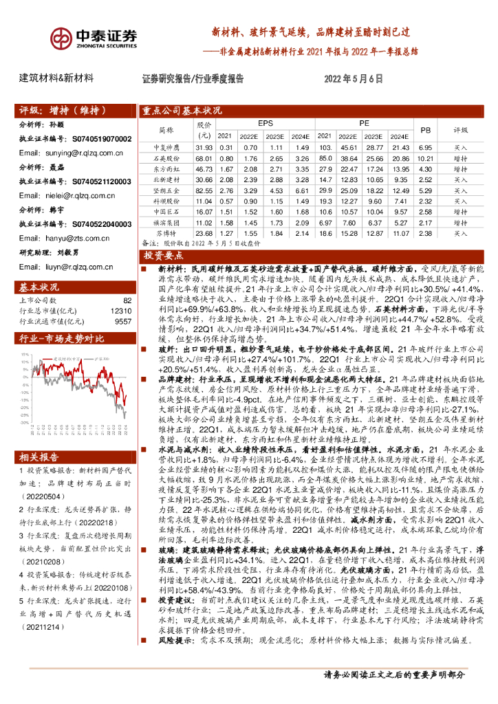 中泰证券:非金属建材&新材料行业2021年报与2022年一季报总结:新材料、玻纤景气延续,品牌建材至暗时刻已过.pdf