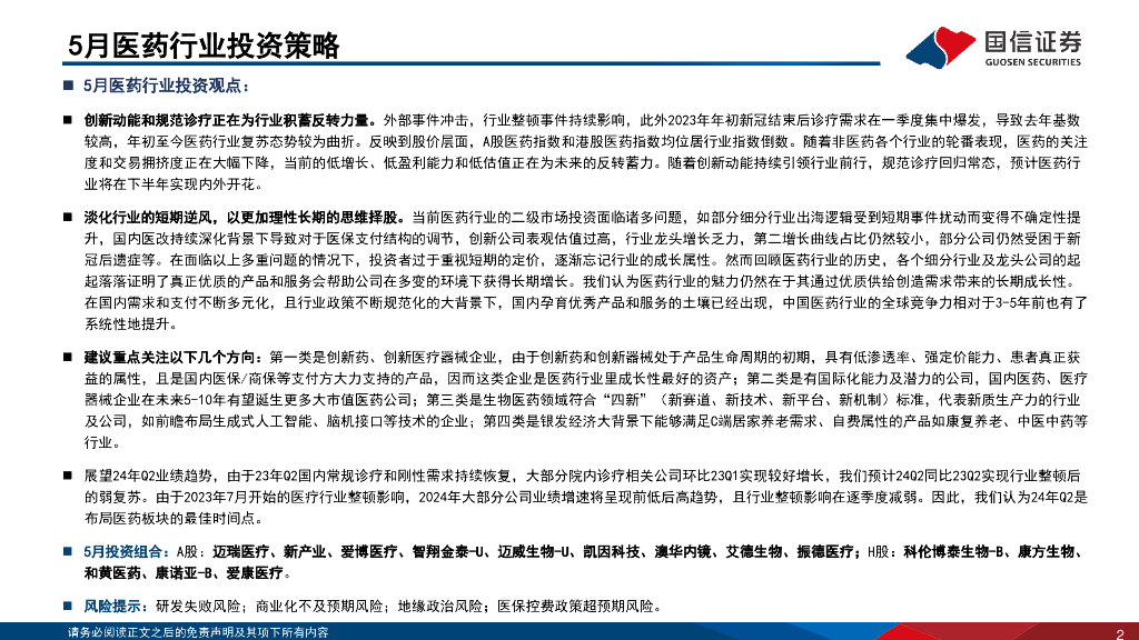 国信证券:医药生物行业2024年5月投资策略:一季报整体表现承压,创新药商业化成效卓著.pdf