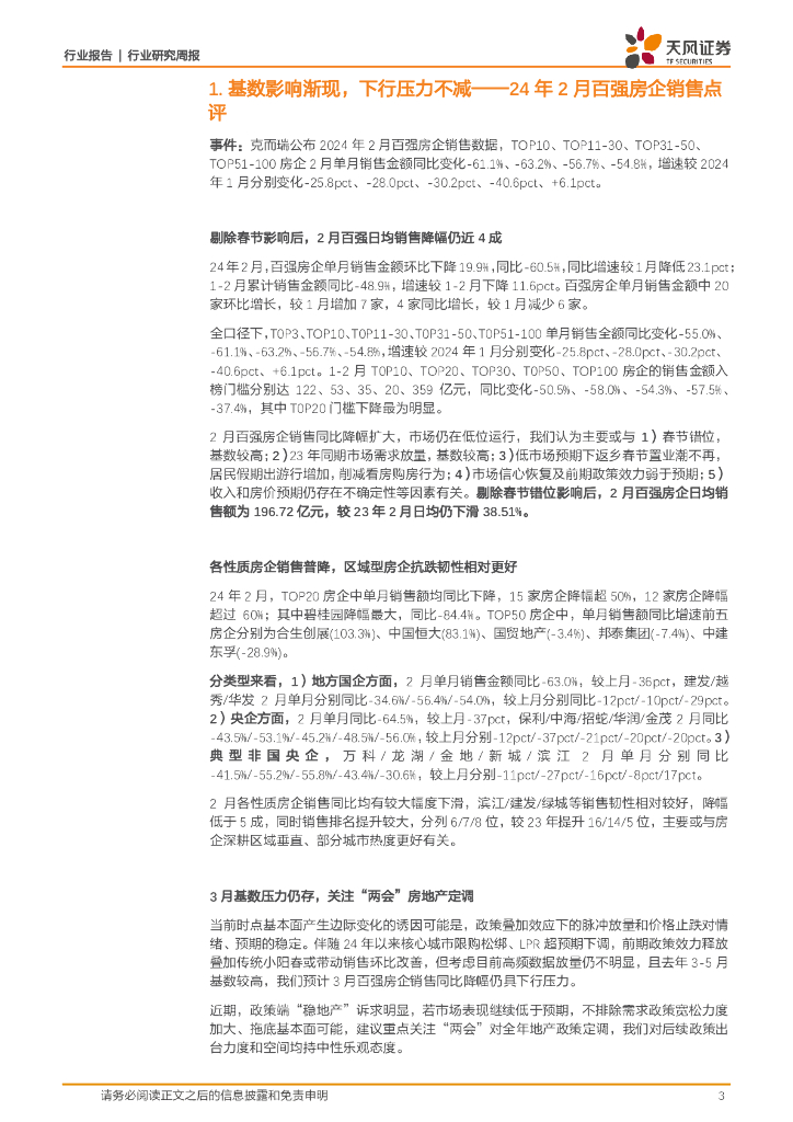 天风证券:房地产行业24年2月百强房企销售点评:基数影响渐现,下行压力不减.pdf