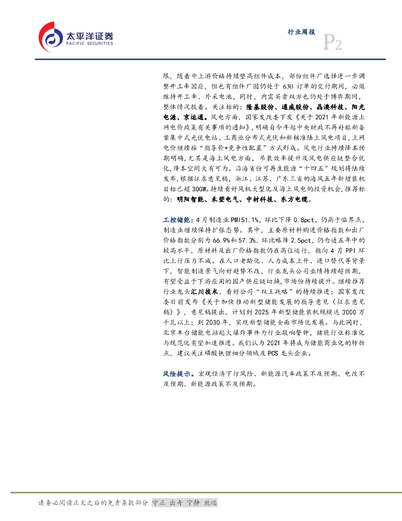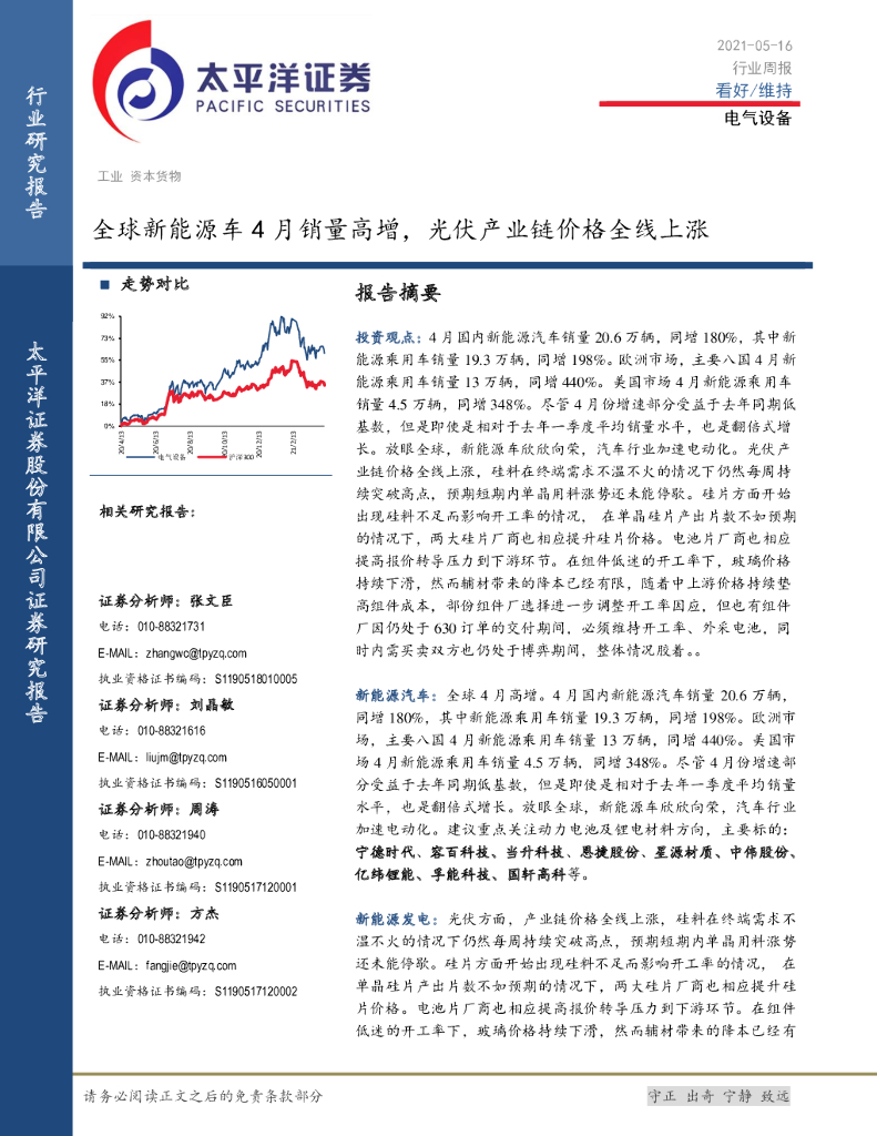 太平洋证券:电气设备行业周报:全球新能源车4月销量高增,光伏产业链价格全线上涨.pdf