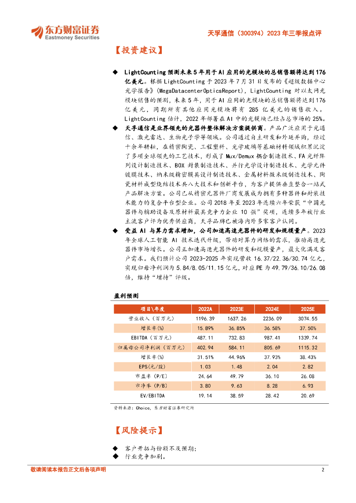 东方财富证券:天孚通信(300394)-2023年三季报点评:AI拉动高速光器件需求,订单饱和,盈利能力改善.pdf