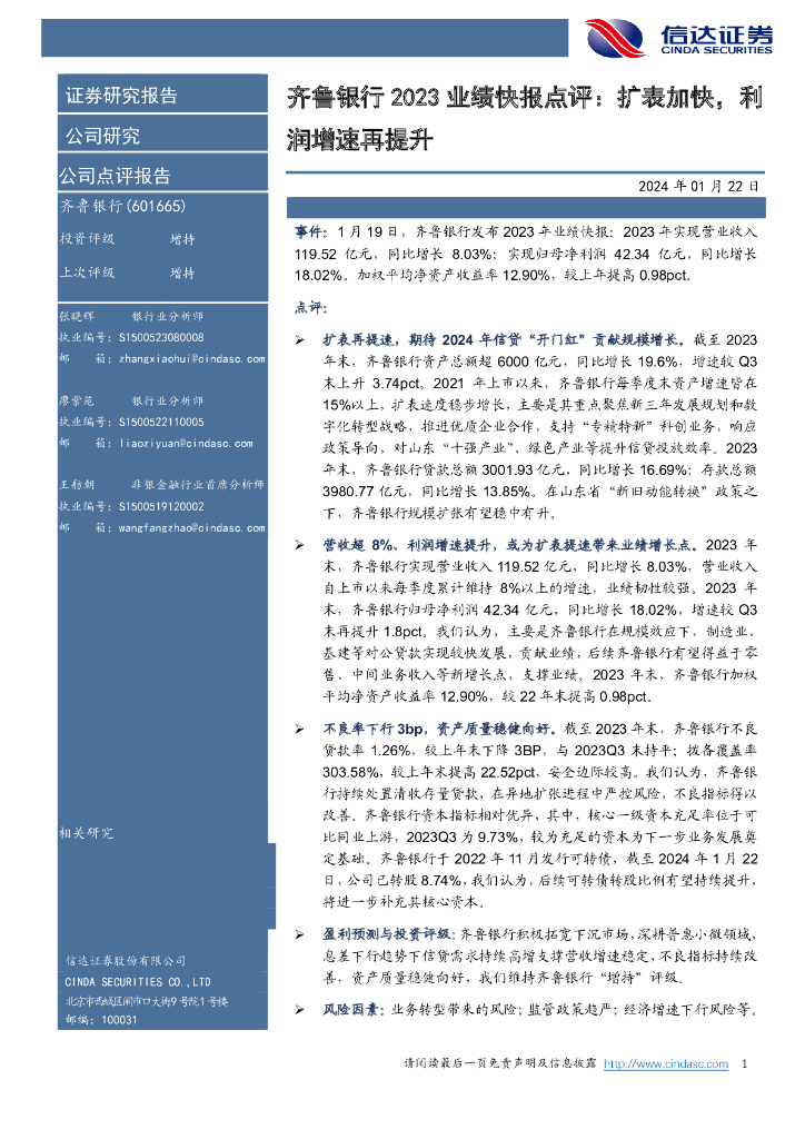 信达证券:齐鲁银行2023业绩快报点评:扩表加快,利润增速再提升.pdf