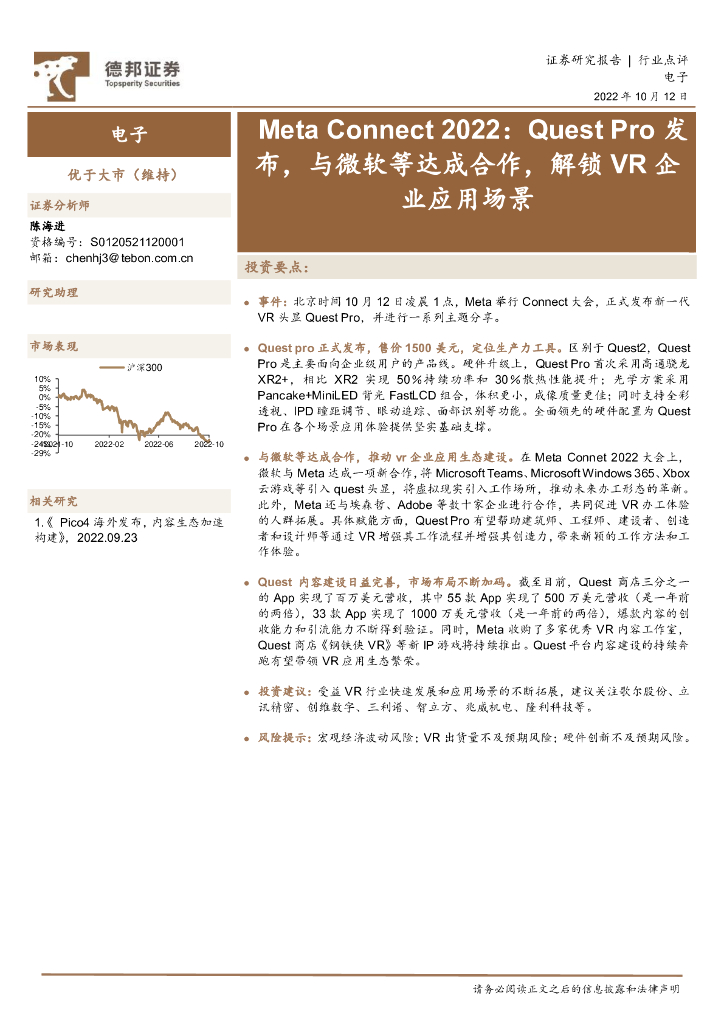 德邦证券:电子:Meta Connect2022:Quest Pro发布,与微软等达成合作,解锁VR企业应用场景.pdf