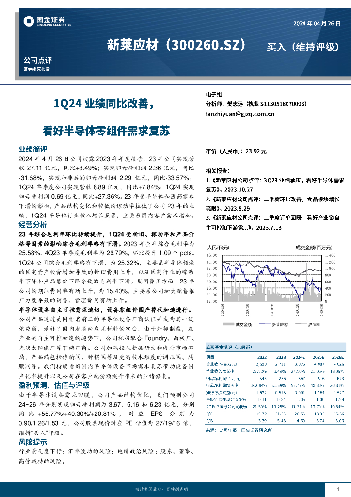 国金证券:新莱应材(300260)-1Q24业绩同比改善,看好半导体零组件需求复苏.pdf