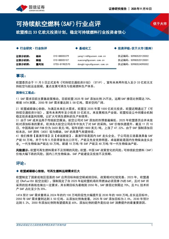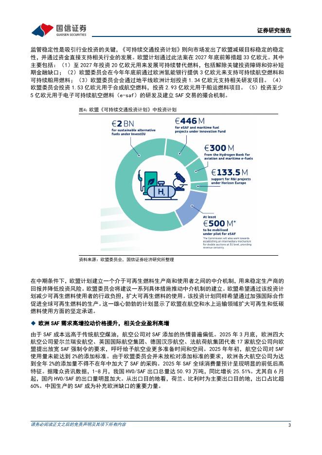 国信证券:可持续航空(SAF)行业点评:欧盟推出33亿欧元投资计划,稳定可持续燃料行业投资者信心.pdf