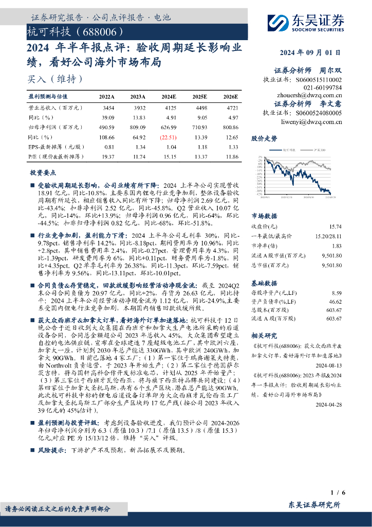 东吴证券:杭可科技(688006)-2024年半年报点评:验收周期延长影响业绩,看好公司海外市场布局.pdf