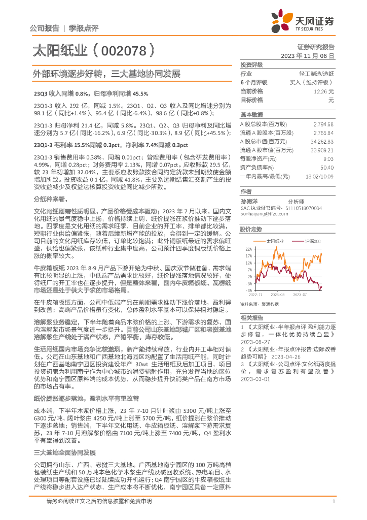 天风证券:太阳纸业(002078)-外部环境逐步好转,三大基地协同发展.pdf