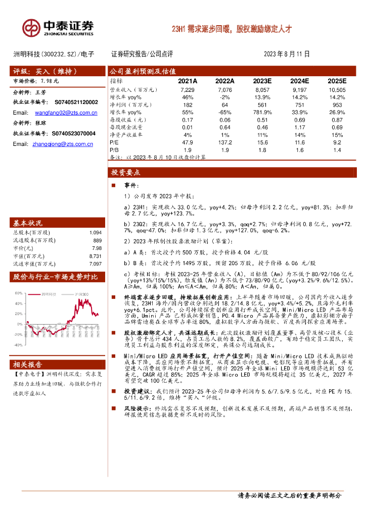 中泰证券:洲明科技(300232)-23H1需求逐步回暖,股权激励绑定人才.pdf