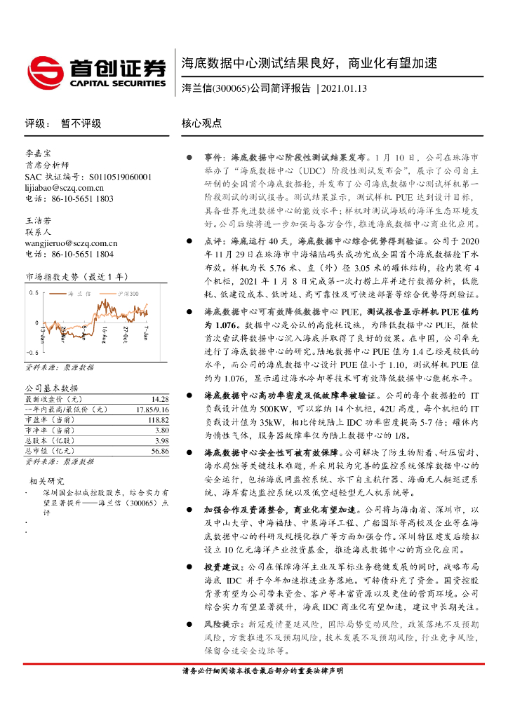 首创证券:海兰信(300065)-公司简评报告:海底数据中心测试结果良好,商业化有望加速.pdf