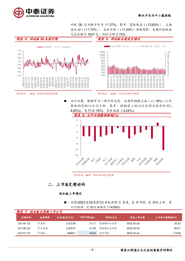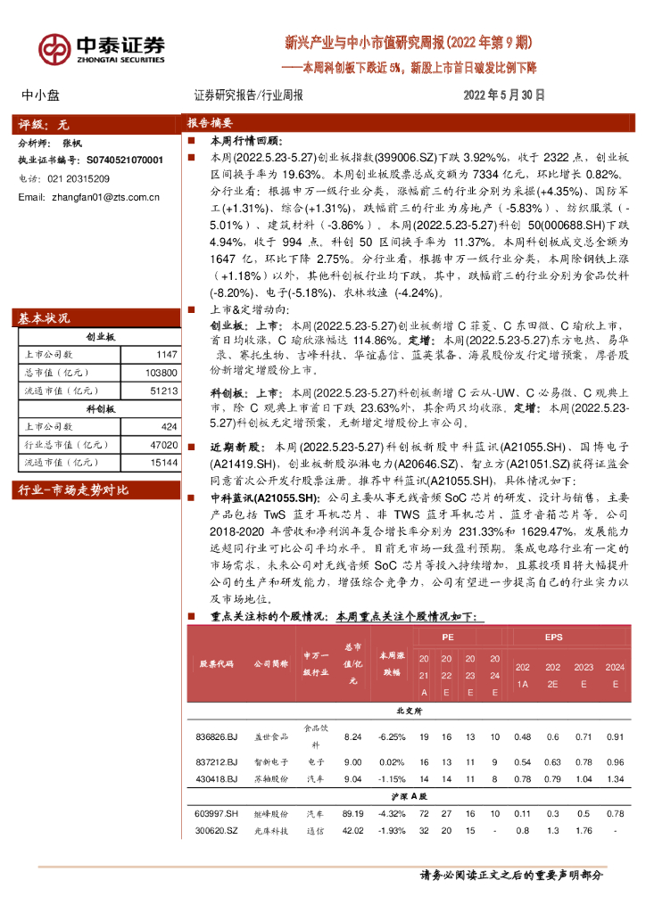 中泰证券:新兴产业与中小市值研究周报(2022年第9期):本周科创板下跌近5%,新股上市首日破发比例下降.pdf
