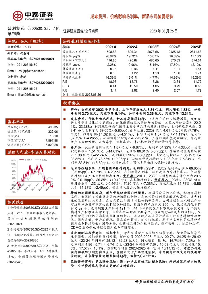 中泰证券:普利制药(300630)-成本费用、价格影响毛利率,新品布局值得期待.pdf