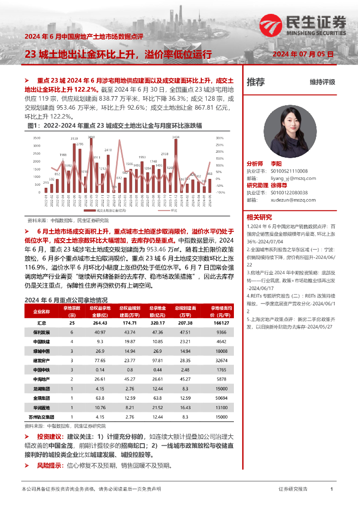 民生证券:2024年6月中国房地产土地市场数据点评:23城土地出让金环比上升,溢价率低位运行.pdf