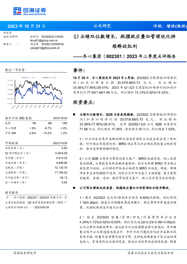 国海证券:齐心集团(002301)-2023年三季度点评报告:Q3业绩双位数增长,规模效应叠加管理优化持续释放红利.pdf