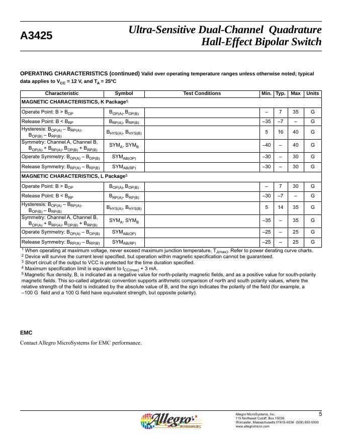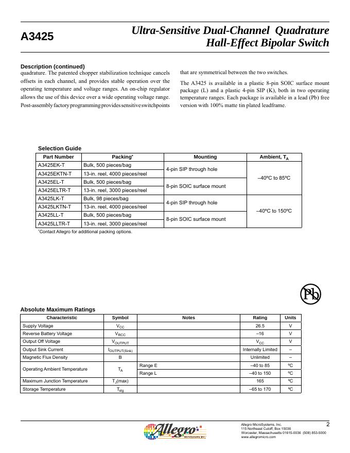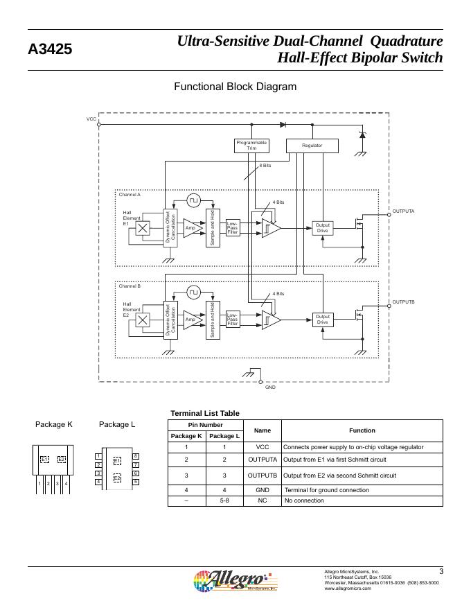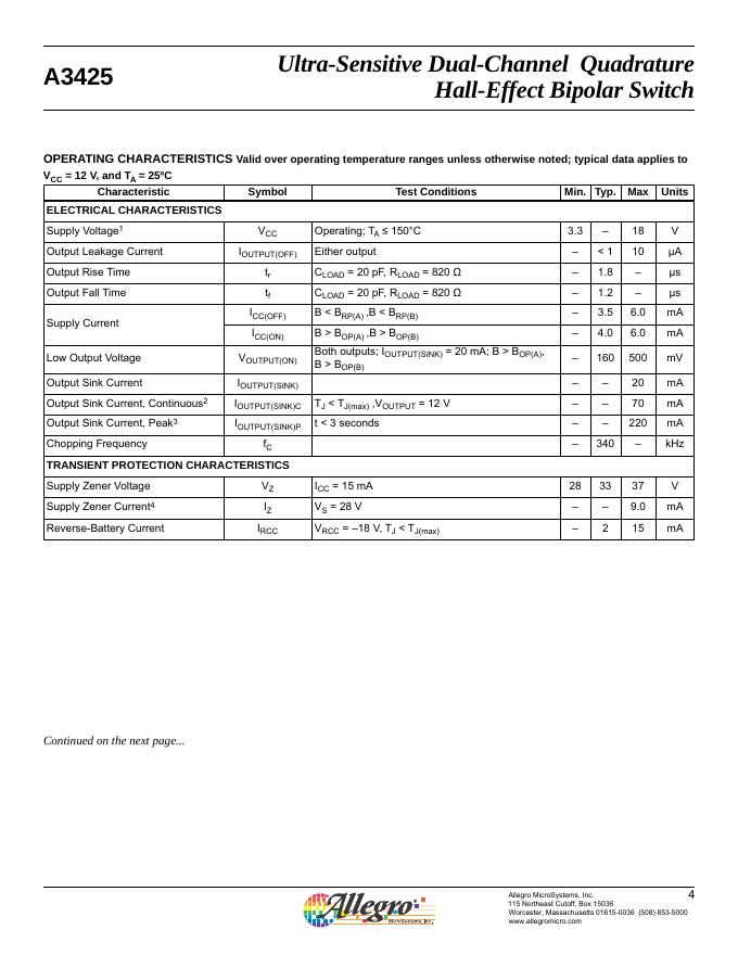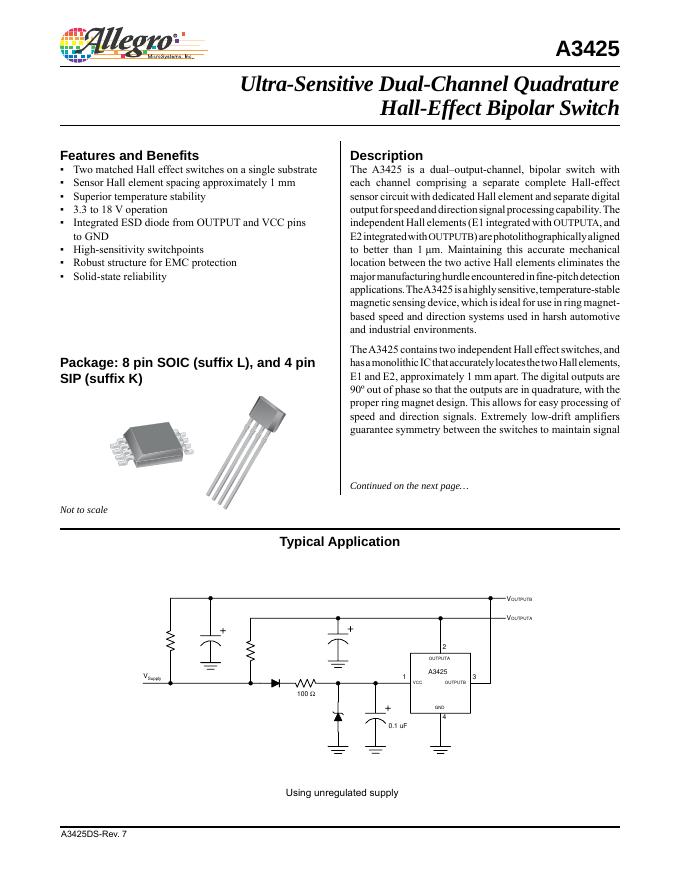 ALLEGRO A3425 Ultra-Sensitive Dual-Channel Quadrature Hall-Effect Bipolar Switch 数据手册.pdf