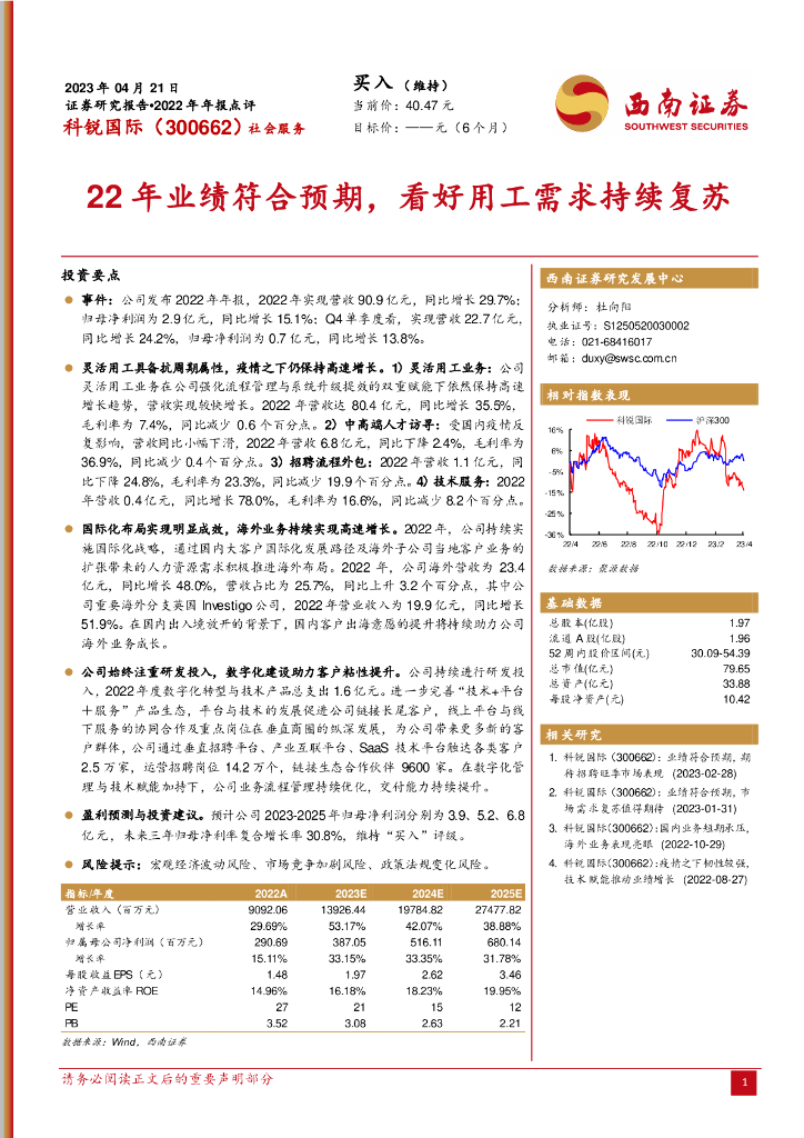 西南证券:科锐国际(300662)-22年业绩符合预期,看好用工需求持续复苏.pdf
