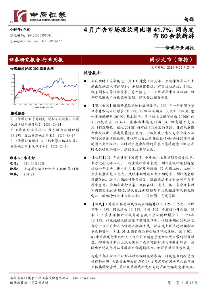 中原证券:传媒行业周报:4月广告市场投放同比增41.7%,网易发布60余款新游.pdf