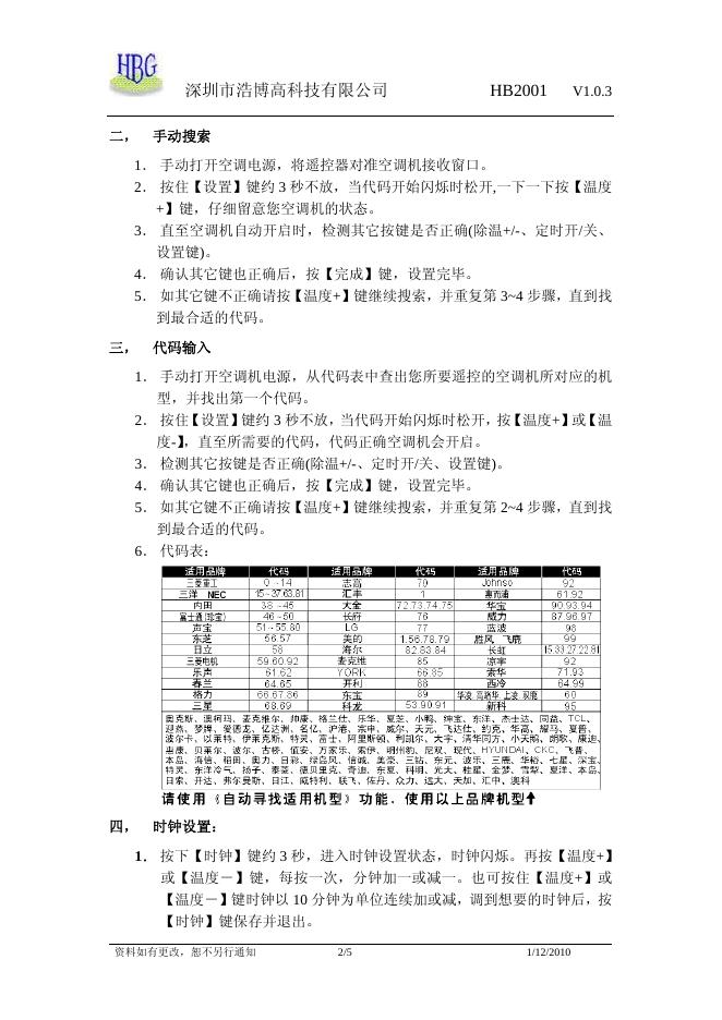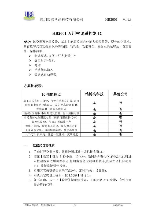 深圳市浩博高科技有限公司 HB2001 万用空调遥控器 IC 用户手册.pdf