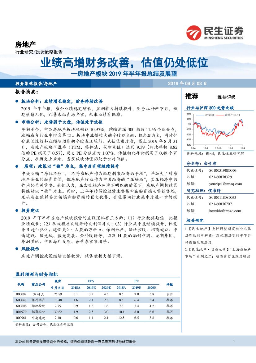 民生证券:房地产板块2019年半年报总结及展望:业绩高增财务改善,估值仍处低位.pdf