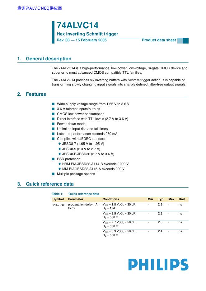 飞利浦 74ALVC14 Hex inverting Schmitt trigger 数据手册.pdf
