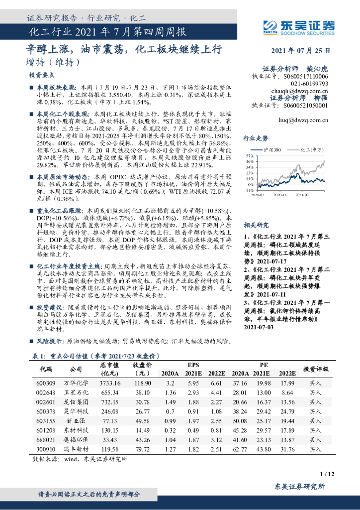 东吴证券:化工行业2021年7月第四周周报:辛醇上涨,油市震荡,化工板块继续上行.pdf