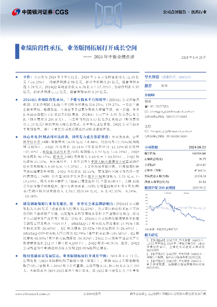 中国银河:华大智造(688114)-2024年中报业绩点评:业绩阶段性承压,业务版图拓展打开成长空间.pdf