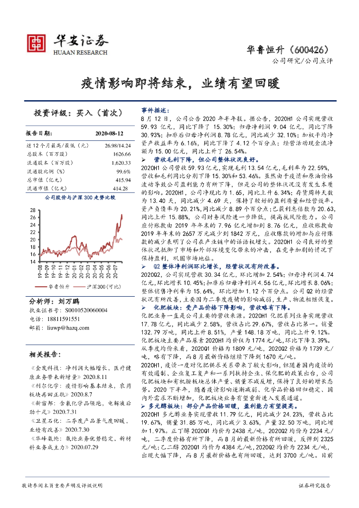 华安证券:华鲁恒升(600426)-疫情影响即将结束,业绩有望回暖.pdf