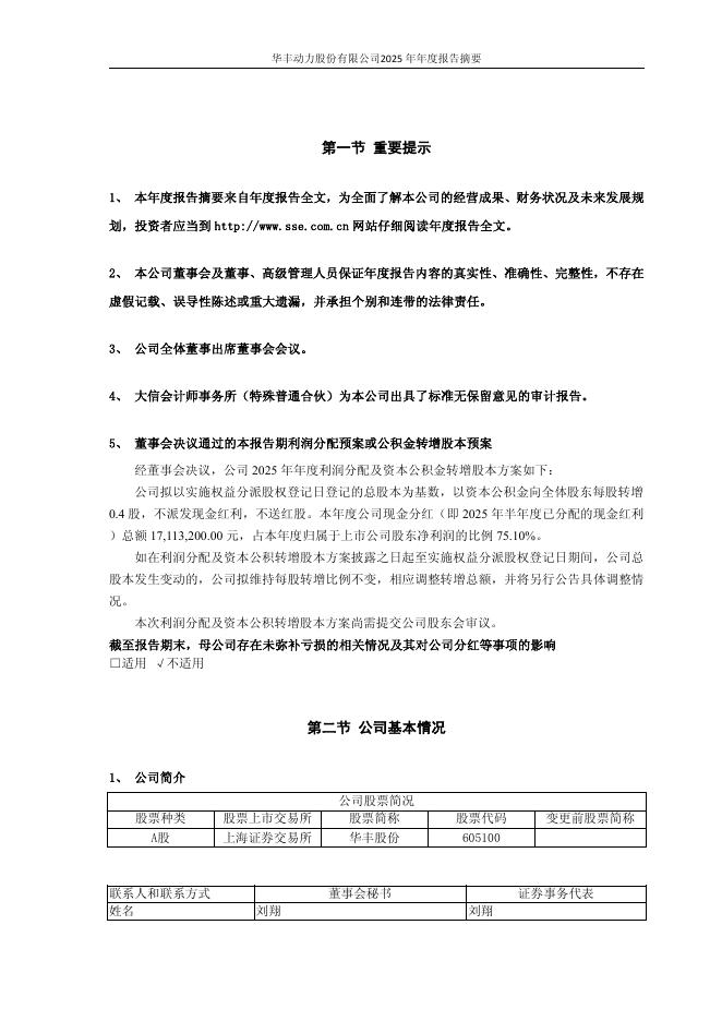 605100-华丰股份:华丰动力股份有限公司2025年年度报告摘要.pdf
