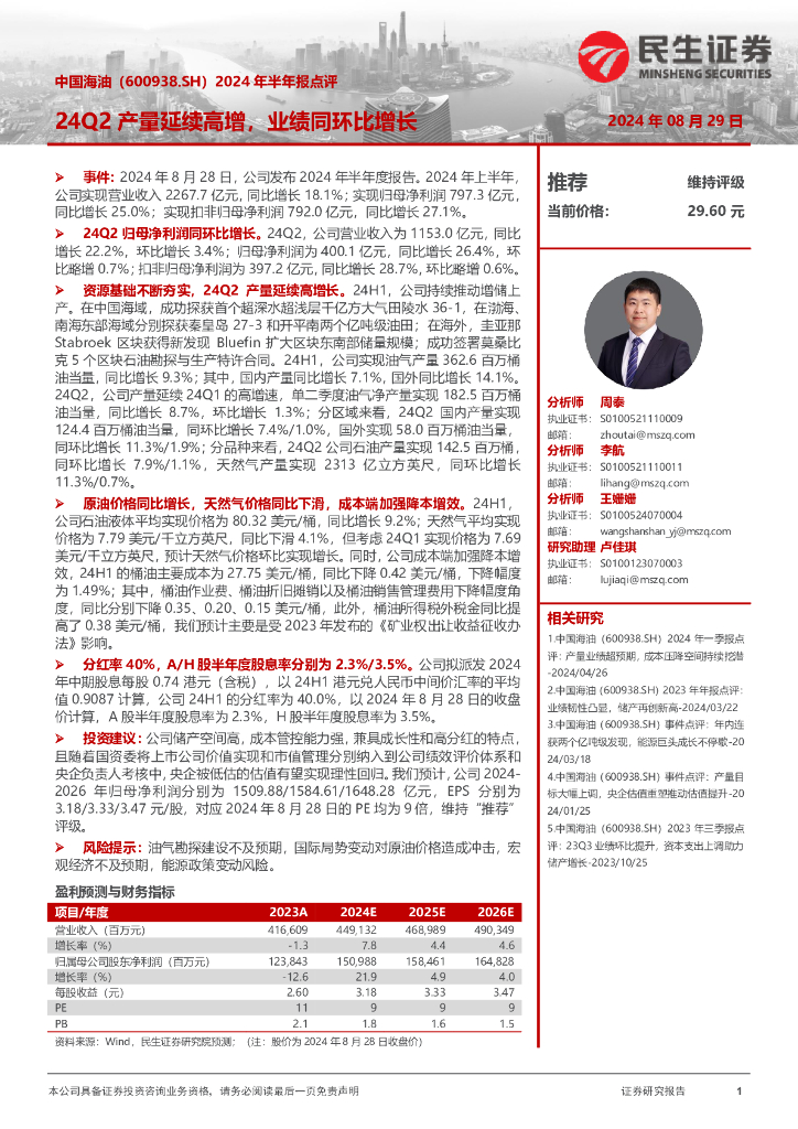 民生证券:中国海油(600938)-2024年半年报点评:24Q2产量延续高增,业绩同环比增长.pdf