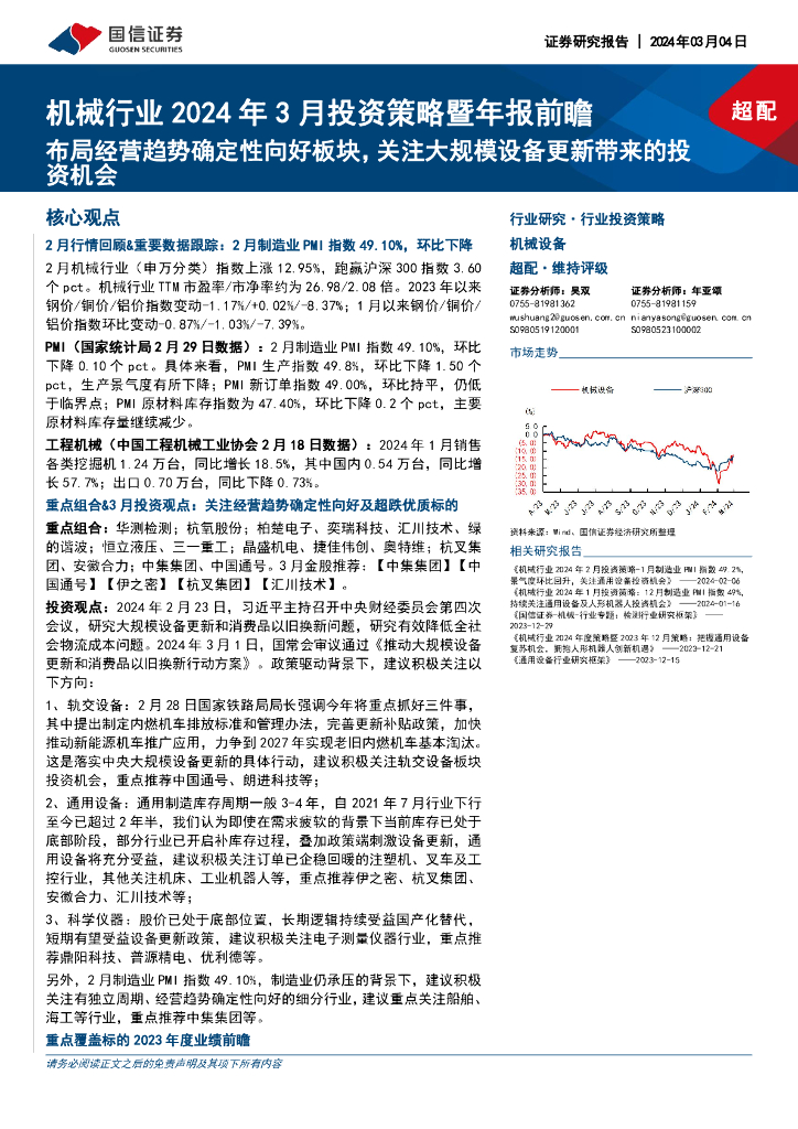 国信证券:机械行业2024年3月投资策略暨年报前瞻:布局经营趋势确定性向好板块,关注大规模设备更新带来的投资机会.pdf
