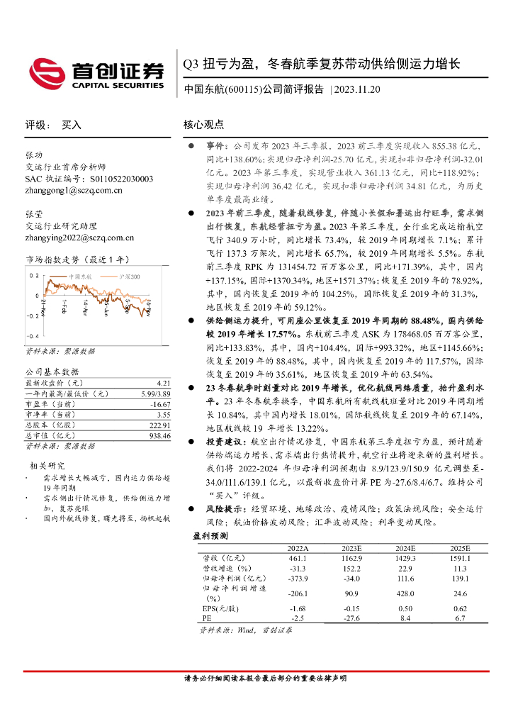 首创证券:中国东航(600115)-公司简评报告:Q3扭亏为盈,冬春航季复苏带动供给侧运力增长.pdf