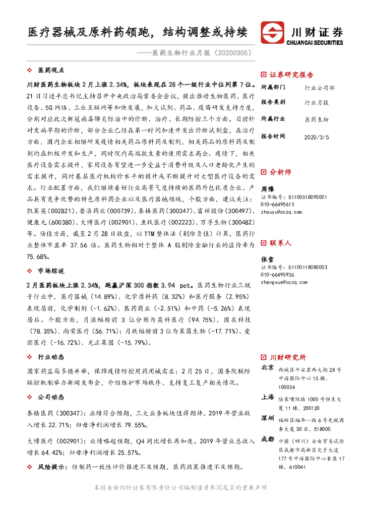 川财证券:医药生物行业月报:医疗器械及原料药领跑,结构调整或持续.pdf