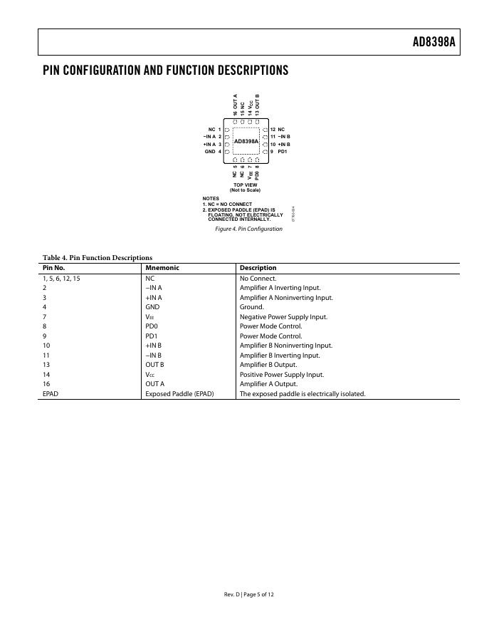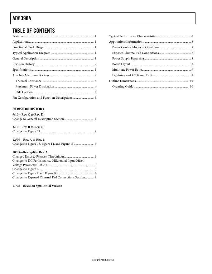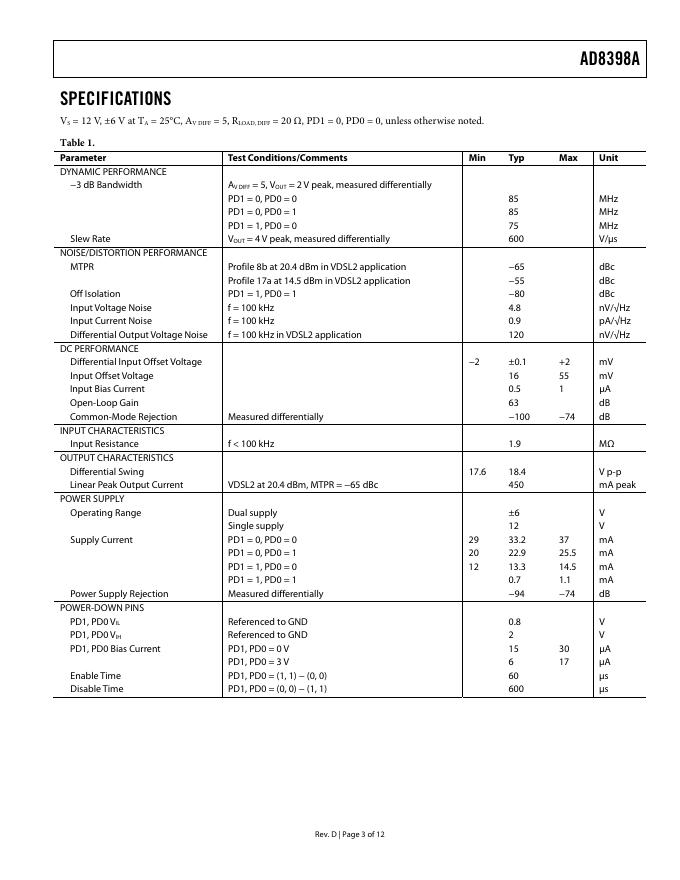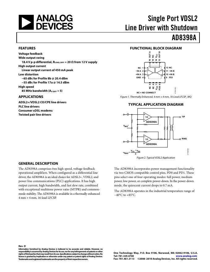 ANALOG DEVICES Single Port VDSL2 Line Driver with Shutdown AD8398A 英文产品 数据手册 Rev C.pdf