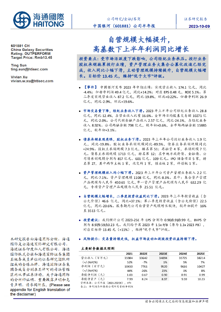 海通国际:中国银河(601881)-公司半年报:自营规模大幅提升,高基数下上半年利润同比增长.pdf