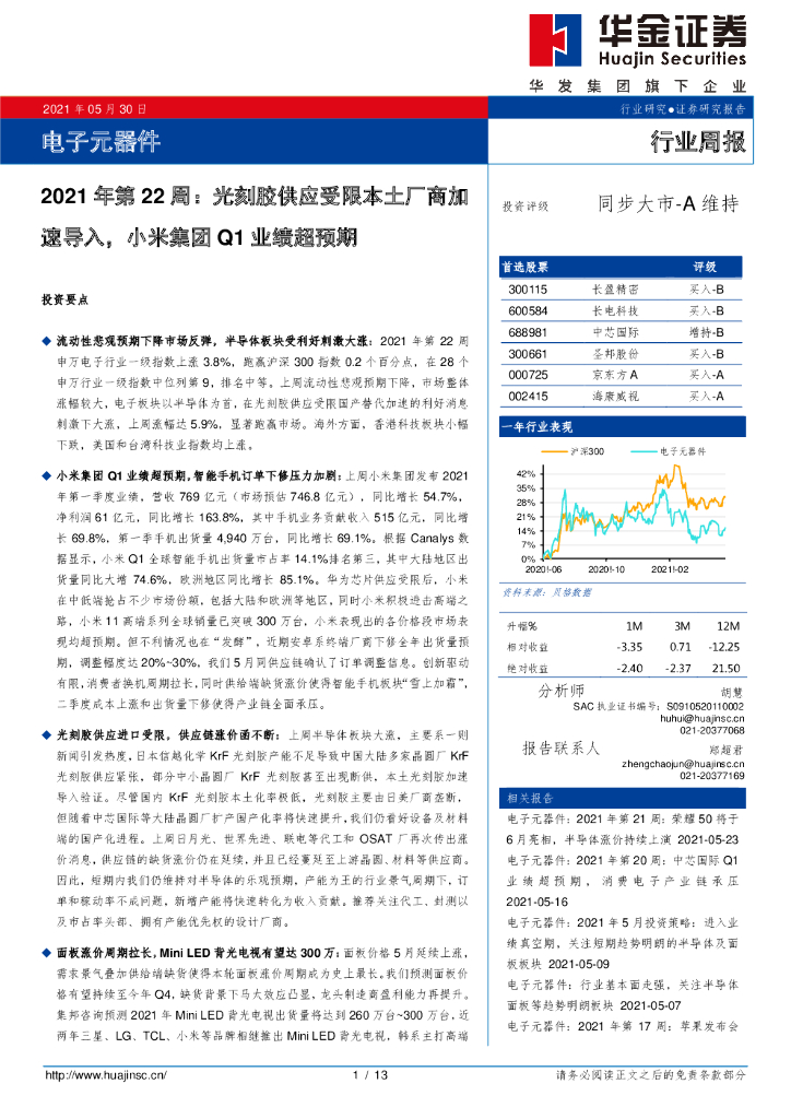 华金证券:电子元器件2021年第22周:光刻胶供应受限本土厂商加速导入,小米集团Q1业绩超预期.pdf