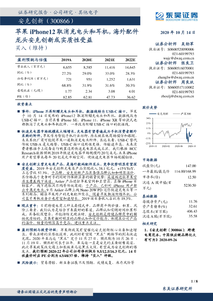 东吴证券:苹果iPhone12取消充电头和耳机,海外配件龙头安克创新或实质性受益.pdf