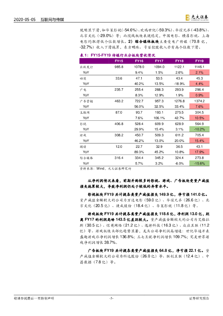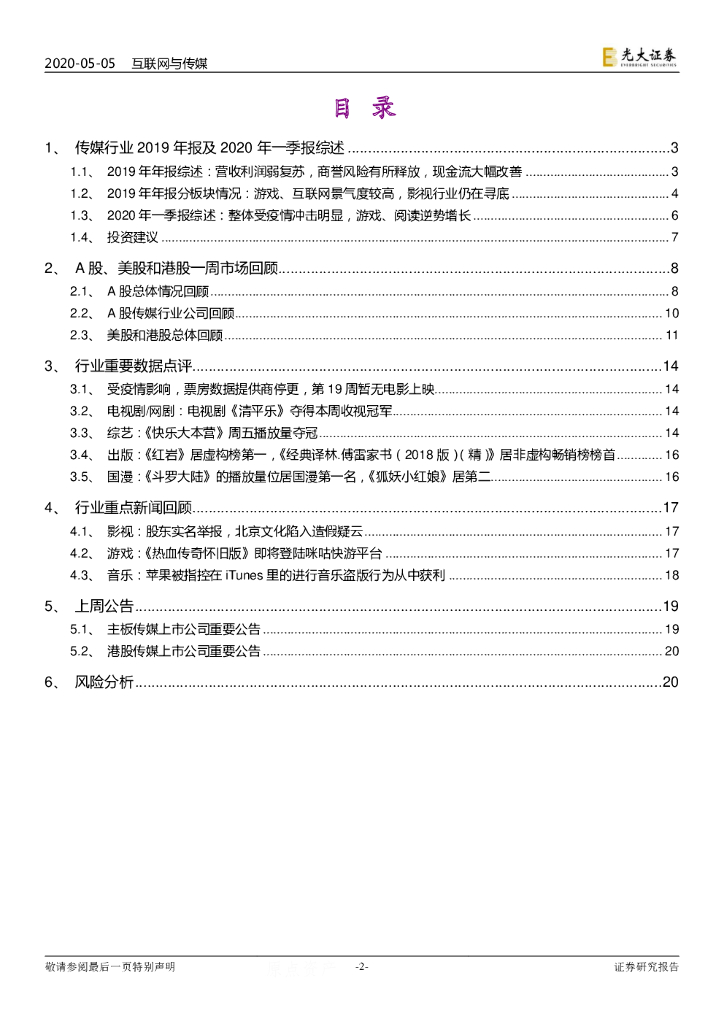 光大证券:光大传媒互联网周报:FY19传媒行业营收利润弱复苏 20Q1游戏与阅读逆势增长.pdf