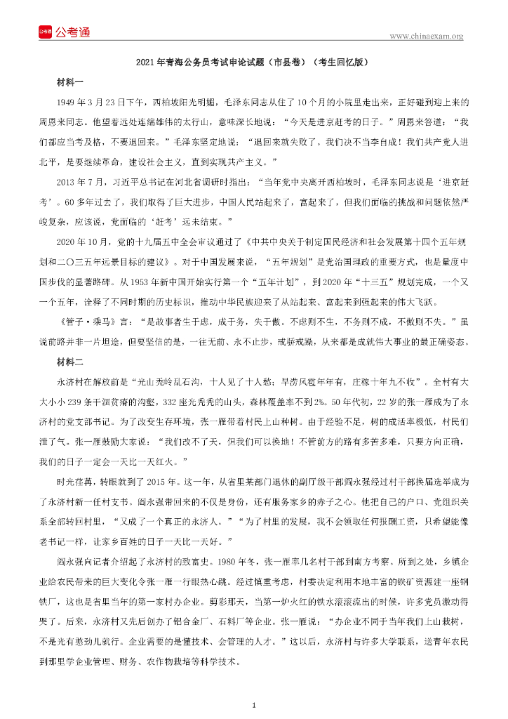 2021年青海公务员考试申论试题(市县卷)(考生回忆版).pdf