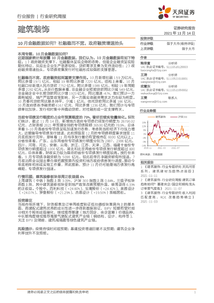天风证券:建筑装饰行业研究周报:10月金融数据如何?社融稳而不宽,政府融资增速抬头.pdf