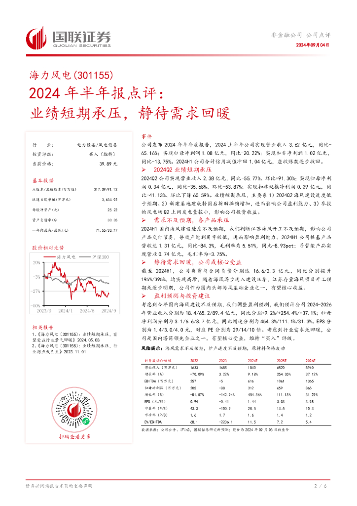 国联证券:海力风电(301155)-2024年半年报点评:业绩短期承压,静待需求回暖.pdf