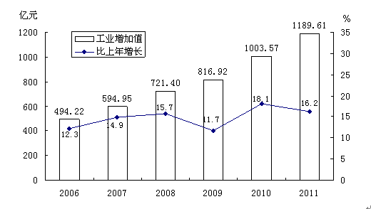 图3 2006-2011年全部工业增加值及其增长速度
