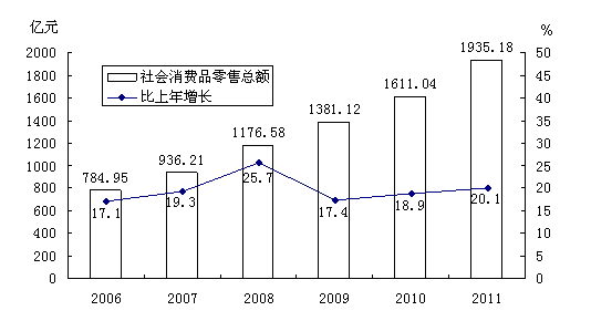 图6 2006-2011年社会消费品零售总额及其增长速度
