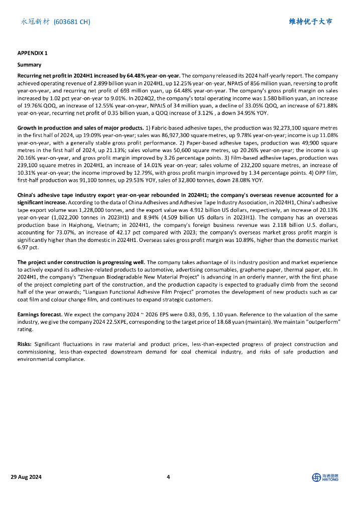 海通国际:永冠新材(603681)-2024H1扣非后净利润同比增长64.48%,海外市场收入占比显著提高.pdf